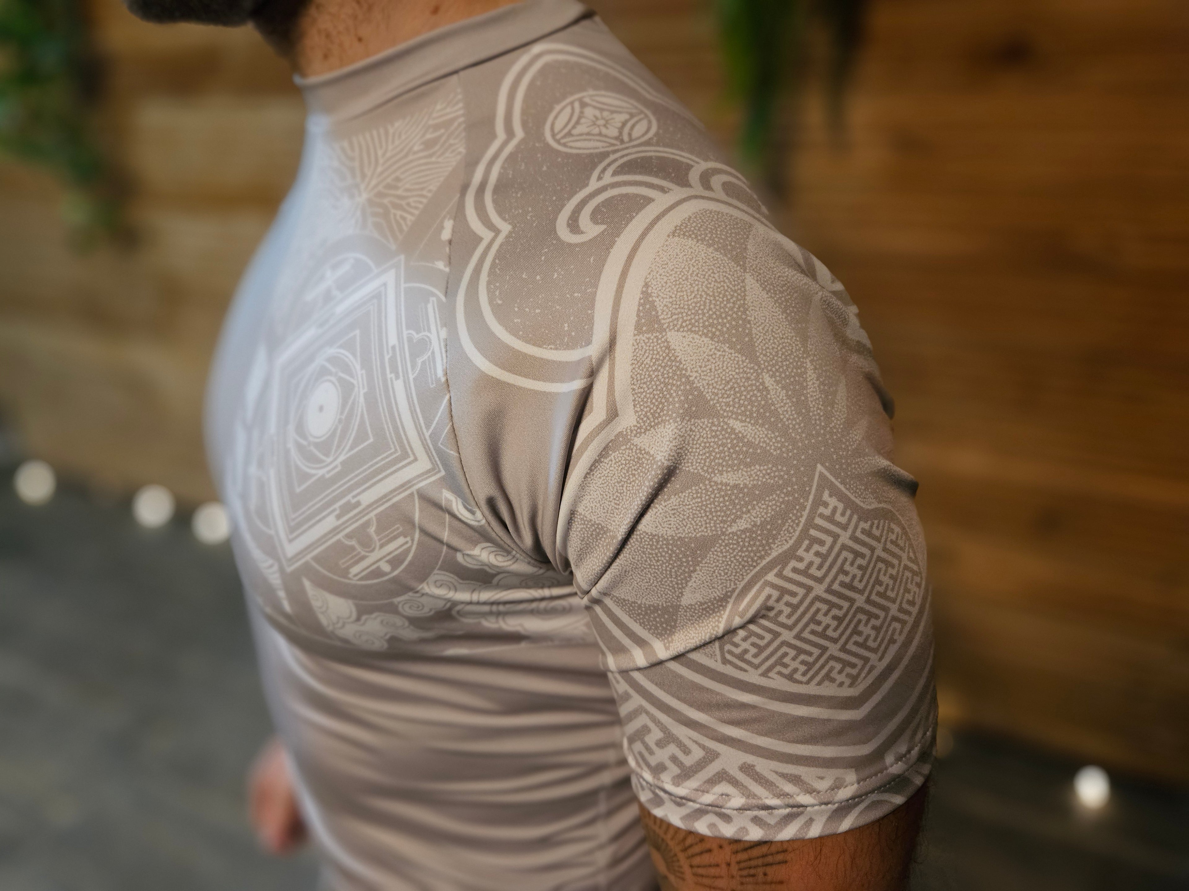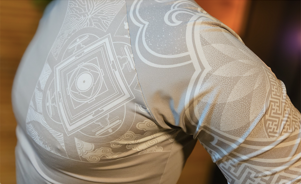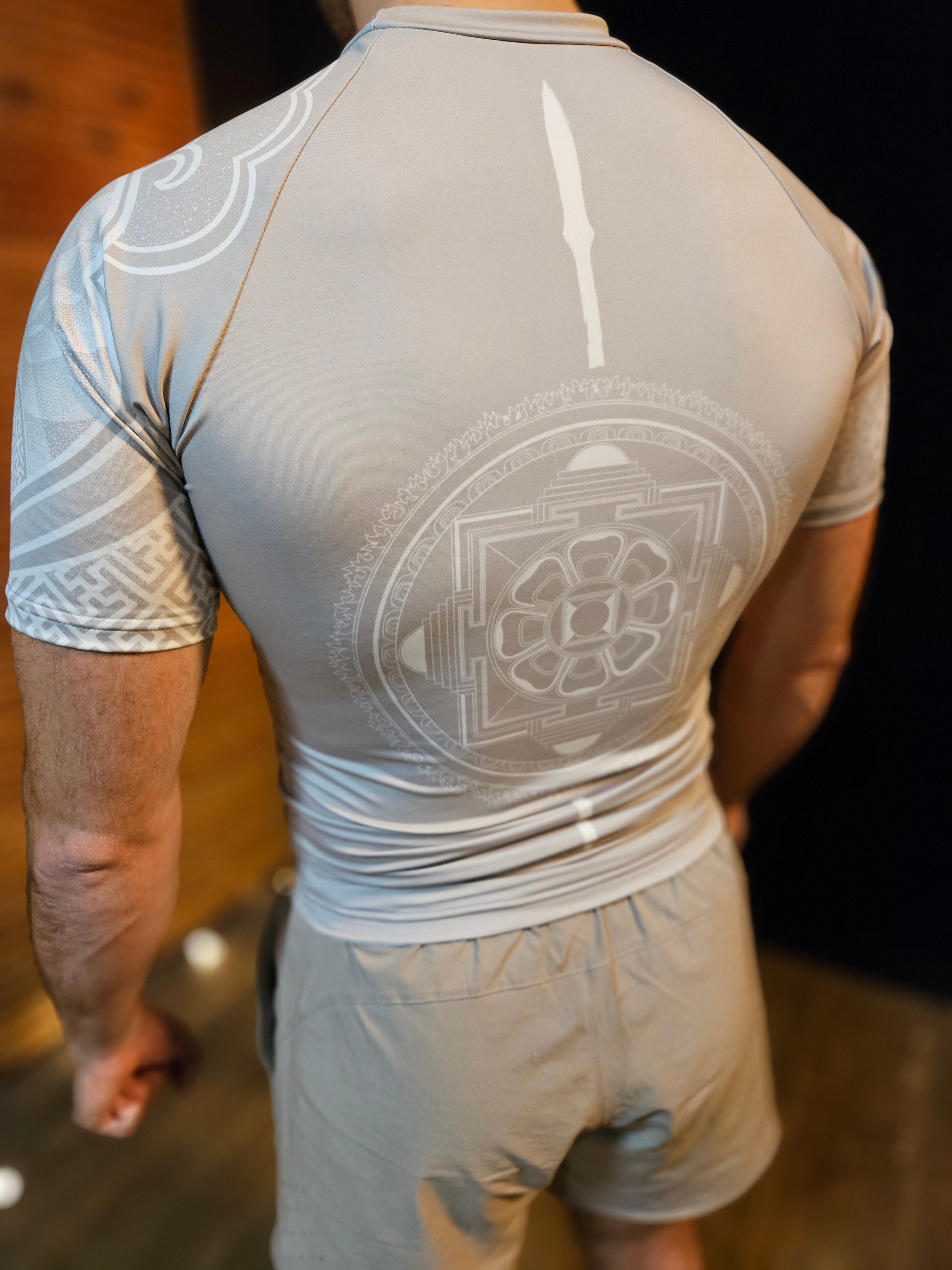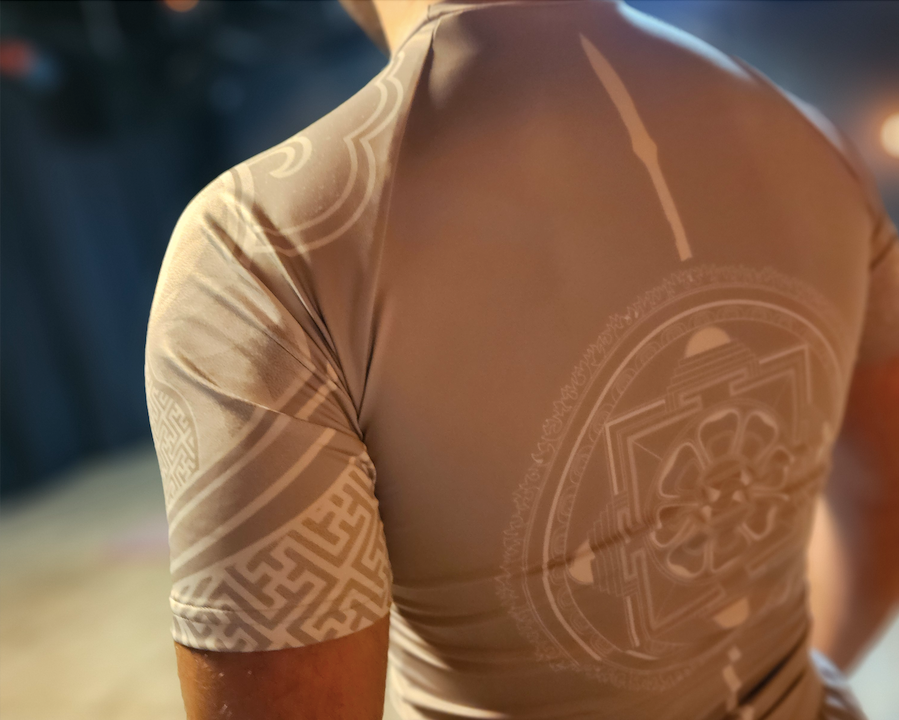 The front of the rashguard features a motif of the four cardinal directions, based on the Warrior Move training mandala .